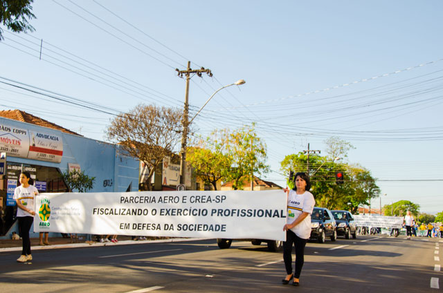 A AERO – Associação dos Engenheiros, Arquitetos e Agrônomos da Região de Ourinhos, juntamente com seus parceiros CREA/SP – Conselho Regional de Engenharia e Agronomia do Estado de São Paulo e AADF – Associação de Assistência ao Deficiente Físico de Ourinhos, participaram do Desfile Cívico de 7 de setembro, organizado pela Prefeitura Municipal de Ourinhos através da Secretaria Municipal de Educação, realizado no último sábado. Com início ás 08h00, o desfile em comemoração a Independência do Brasil percorreu toda a extensão da Av. Altino Arantes e contou com a participação dos alunos das Escola Municipais, da EMMO-Escola Municipal de Música de Ourinhos, Colégio Objetivo, fanfarras, e apresentação do Tiro de Guerra, Polícia Rodoviária Federal, Polícia Militar, Corpo de Bombeiros, SAMU, Guarda Mirim AMO/SIM e diversas entidades de Ourinhos.
